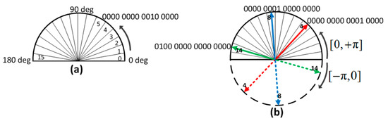 Experts usually chose to consider image edge gradients because they are proved to be more discriminant than other forms of representations [16,35]. To accelerate the matching process, the gradient direction is quantized and a binary string is employed to represent the quantized direction. As illustrated in Figure 1a, a semicircular space is divided into N parts (e.g, N = 16) which are congruent with each other, and each part is represented by a binary string. In order not to be affected by whether the object is over a dark background or a bright background, we only consider the orientation of the gradient, as shown in Figure 1b, if the angle of the direction is less than 0, it will be mapped to the upper half of the circle. As shown in Figure 1b, the orientation is encoded by a binary string, and each individual bit of the string corresponds to one quantized orientation.