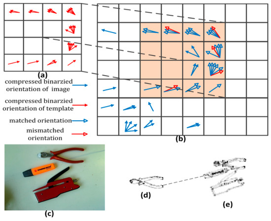 An example to explain the process of producing the binarized orientation compressing map. (a) The model image; (b) Original quantized gradient orientations in the red box of model edge map; (c) The quantized orientation compressing map of Figure 2b; (d) The edge map of the model; (e) The orientation compressing map of the template image.