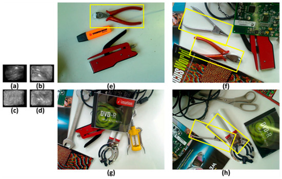 The similarity measure is used to yield a set of possible object locations. In the D-Textureless dataset [23], models are rotated and scaled in the test images and the test images are 640 × 480 pixels as shown in Figure 4. For the red plier model, it appears in Figure 4e,f respectively, which are the positive test samples. Figure 4g,h are the negative test samples. Before matching with these test images, the model is performed scale and rotation transformation, which can generate 252 templates by rotating the model in the range of with increment and scaling the model in the range of [60%, 90%] with 5% increment. The model can be easily learned because the learning process only requires generating and storing the orientation compressing maps of these templates (CMT) with different scales and rotations. For the precision and computational load, is a good trade-off with respect to our experiments, which will be explained in detail in Section 4.1.
