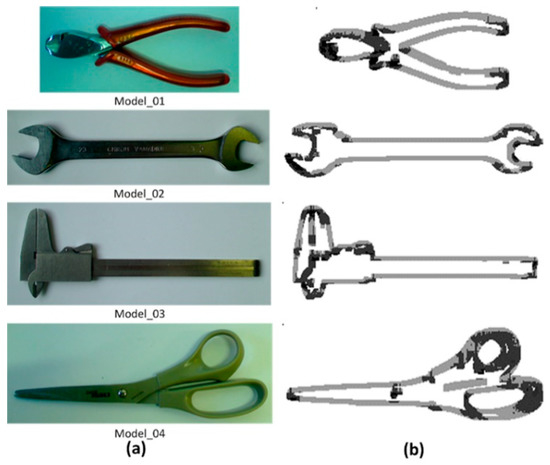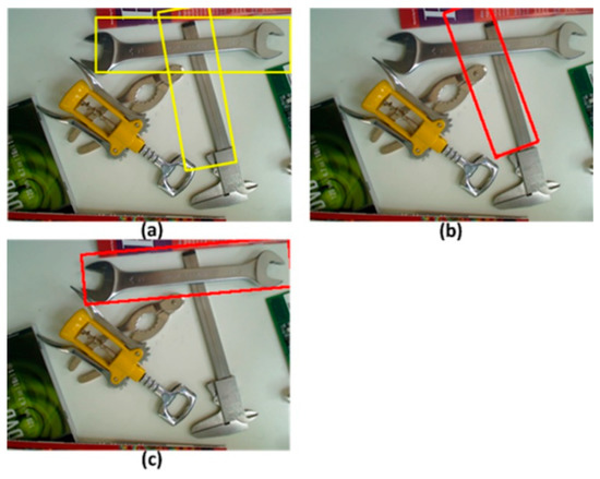 The proposed similarity measure which integrates the discriminative regional weight achieves better results for similar objects recognition. As shown in Figure 6, to detect the spanner model (Model_02), a vernier caliper (Model_03) places in the input image, and part of its texture is similar to spanners’. Consequently, there is a great possibility to mistake the vernier caliper as a spanner without applying the discriminative regional weight as shown in Figure 6b. And Figure 6c represents a correct recognition by using the weight of model as displayed in Figure 6b.