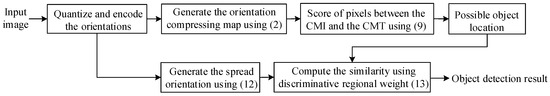 The orientation compressing map of the template (CMT) can be compared with the orientation compressing map of the input image (CMI) pixel by pixel according to the bitwise AND operation: