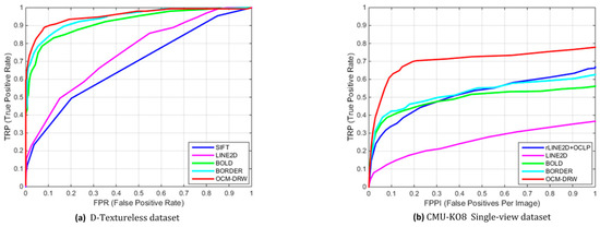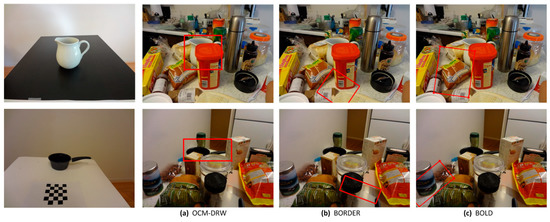 For evaluation the robustness of OCM-DRW with respect to occlusion, the next experiment involves the extremely cluttered and occluded CMU Kitchen Occlusion dataset (CMU-KO8) assembled by Hsiao and Herbert [36]. This dataset consists of common household objects in a more natural setting, and cluttered environments under various levels of occlusion, making this dataset very challenging. It contains 8 texture-less kitchen-wares models, together with 100 scene images for each model in both single view and multiple view situations. In addition, each single-view scene image holds only one instance of a model object and contains ground truth labels of the occlusions. According to the dataset, Hsiao and Herbert propose three different variants of LINE2D (rLINE2D, rLINE2D+OPP and rLINE2D+OCLP) [36]. For OCM-DRW evaluation, each model does not have significant scale and rotation changes over the test images in the single-view dataset. Therefore, only 9 templates are trained by the scale and rotation transformation, which creates templates by rotating the template in the range of with increment and scaling the template in the range of [95%, 105%] with 5% increment. We attain the results of OCM-DRW, BORDER, BOLD, LINE2D and rLINE2D+OCLP in terms of recall versus FPPI (False Positives PerImage) scheme [18] as portrayed to assess the detection rate in the single-view scene. In addition, rLINE2D+OCLP is used to compare with other detectors due to the best recognition result of it among three different variants of LINE2D. SIFT is not included because of the lack of keypoint information for most of the models in this dataset. The similarity measure used by OCM-DRW make this method have good robustness of clutter, which explained in expression (6). Figure 10b shows the performance of OCM-DRW over the others in the single-view database, also revealing OCM-DRW’s robustness in heavy occlusion and clutter. OCM-DRW performs better than BORDER and BOLD, it can detect the target object partially covered in the cluttered background as shown in Figure 12.