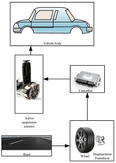 In addition to transferring the reaction force directly to the chassis, the design of the suspension system aims to relax the road surface impact, attenuate vibration, ensure vehicle ride comfort and stability control capacities. The active suspension system includes an actuator, a matching sensor, and a control unit that can input force and displacement to the suspension system based on the passive suspension system. The actuator can generate force according to the real-time changes of the road input and the vehicle status, thereby compensating for the disturbances produced by road irregularities and obtaining a good shock absorption effect []. The control principle of the active suspension system is shown in Figure 1.