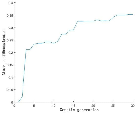 As a GA is an efficient optimization method in solving complex problems of high-multimodal, multi-dimensionality, nonlinear, discrete, and discontinuous characters, it has been widely used in engineering fields in the past few years []. Thus, a GA is applied in this paper to optimize five parameters () of the SMC controller. Based on the maximum of the fitness function, a GA can find the optimal control gain automatically, such that the control system performance is closer to the expected value [].