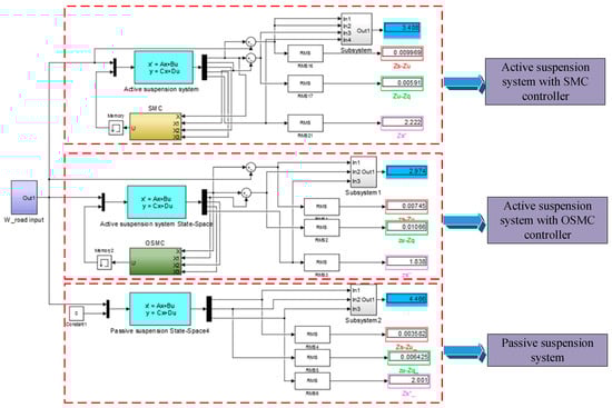 In order to verify the control performance of the OSMC controller optimized by the GA, the models of the passive suspension system and the active suspension system with SMC controller were also built in MATLAB/Simulink. The model of the whole system is shown in Figure 8, and the related parameters of the whole system used in simulations are listed in Table 3.