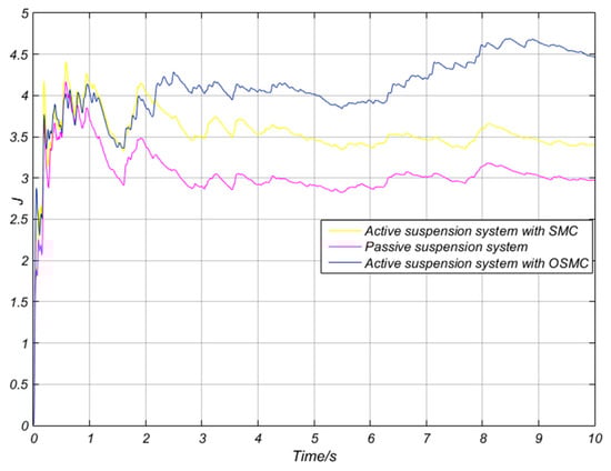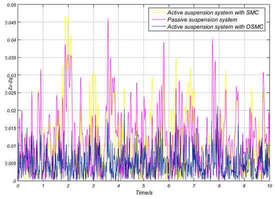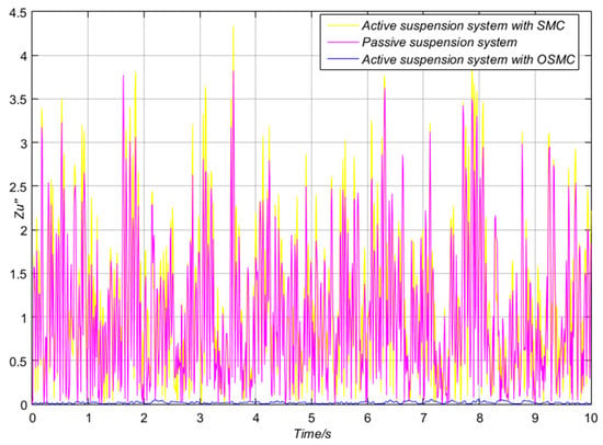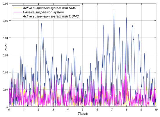 Based on the curves shown from Figure 9, Figure 10, Figure 11 and Figure 12, the indicators of the active suspension system with an OSMC controller, SMC controller, and passive suspension system can be clearly analyzed. In the aspects of vertical acceleration , the active suspension systems excelled over the passive system, and the OSMC controller performed significantly better than the SMC controller in the active suspension system.