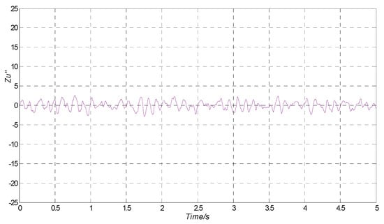As shown in Figure 13, the RMS of the vertical acceleration decreased 19.34% compared with the optimum results in Reference [] based on the OSMC controller. The optimized results in Reference [] are shown in the form of figures, and the optimum vertical acceleration with the OSMC controller are exhibited in Figure 14. Comparing with the vertical acceleration figure in Reference [], it can be found from Figure 14 that the maximum amplitude was smaller, which means that the OSMC controller performed better.