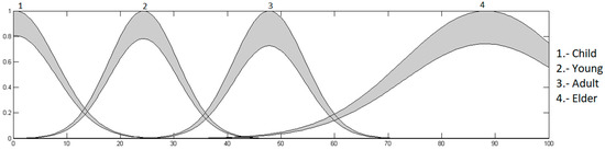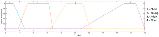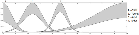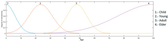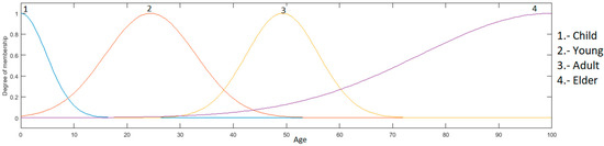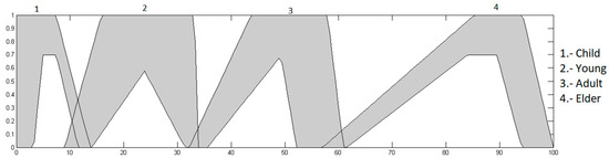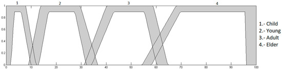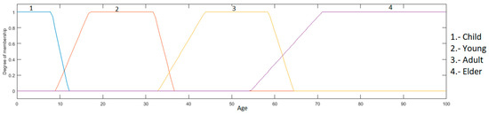 Age input: this is in a range of 0 to 100, granulated into 4 membership functions, having as linguistic values “Child”, “Young”, “Adult” and “Elder”, which are presented in Figure 7.