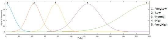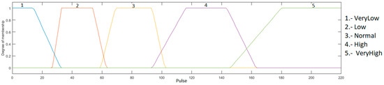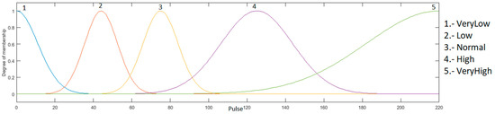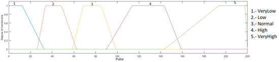 Heart rate input: this input goes between the range of 0 to 220, because it is the maximum heart rate that a young person may have during physical activity, and is granulated into 5 membership functions using the linguistic variables “Very Low”, “Low”, “Normal”, “High” and “VeryHigh”, as presented in Figure 5.