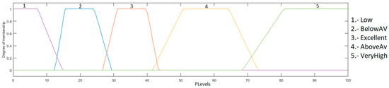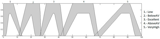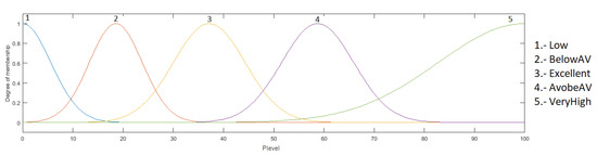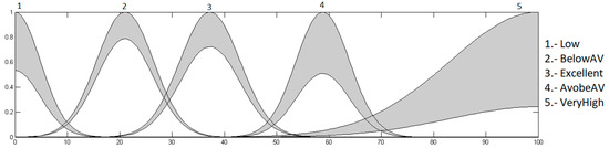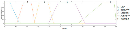 The output is the heart rate level, which ranges from 0 to 100%; this indicates how high or low the patient’s heart rate is, and is granulated into 5 membership functions, with the linguistic variables “Low”, “BelowAV”, “Excellent”, “AboveAV” and “VeryHigh”. As a defuzzification method, the centroid of area was used. The fuzzy system output is illustrated in Figure 6.