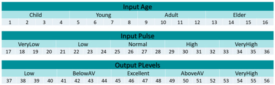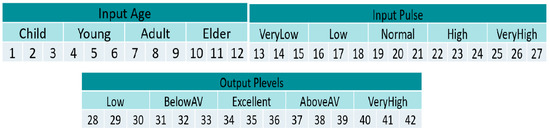 Table 12 presents the age and pulse of the randomized patients when BelowAV is the value below average, Excnt is excellent, AboveAV is above average and Vhigh is very high value. In this case, the non-optimized fuzzy system with trapezoidal membership functions classified 13 patients correctly, and the optimized fuzzy system classified all 15 patients correctly. On the other hand, the non-optimized Gaussian fuzzy system classified 12 patients correctly, and the optimized fuzzy system classified 14 patients correctly. The patients classified incorrectly are highlighted in red.