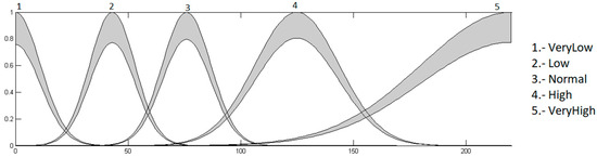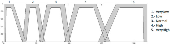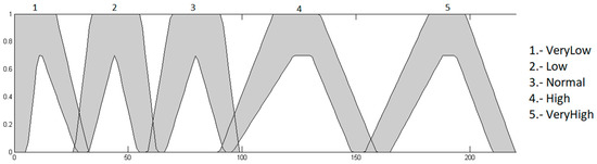 Heart rate input: this input has values in the range of 0 to 220, because it is the maximum heart rate that a young person may have during physical activity, and is granulated into 5 membership functions, which correspond to the linguistics values “Very Low”, “Low”, “Normal”, “High” and “VeryHigh”. This input is presented in Figure 8.