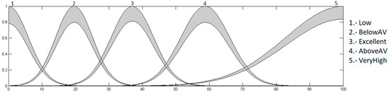 The output is the heart rate level, which has values in the range from 0 to 100%. This indicates how high or low the heart rate of the patient is, which is granulated into 5 membership functions, using the linguistic values “Low”, “BelowAV”, “Excellent”, “AboveAV” and “VeryHigh”. As a defuzzification method, the centroid of area was used. The fuzzy system output is presented in Figure 9.
