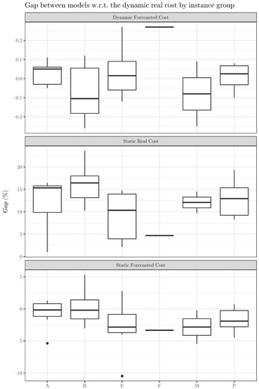 Figure 2 represents graphically the gaps considering the different instance sets. Regarding the gaps between DFC and DRC (first raw of boxplots), we observe that the groups of instances have different distributions of gaps, but they tend to be relatively small. The distributions are relatively symmetric, except for sets A (negative skew) and F (no variability at all). There are no outliers. We focus now on the gaps between SRC and DRC. They range between almost 0% and 25%. The boxplots per group of instances share some similarities with the previous ones: symmetry except for sets A (positive skew) and F (no variability at all), there are no outliers, and the variability (either total range and interquartile range) depends on the set (higher for set E and lower for set M, for example). Finally, the last row displays the boxplot of the gaps between SFC and DR. They range between −10% and 5%, approximately. There are only two outliers, and the variability is also group-dependent: for sets B and E is higher than for F. There is also symmetry in this case. Since there is not any pair of sets with a similar distribution of gaps, it is difficult to link the main differences of the sets (described in Section 5.1) to the boxplots.