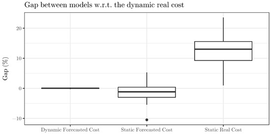 The columns of gaps in Table 1 show the relative differences between the best solutions obtained with the static and dynamic approaches. The positive gaps between SRC and DRC proves the importance of considering the intrinsic dynamism of the system. Indeed, the maximum gap reaches a value of 23.58%, while the average gap is around . All the gaps are strictly positive, thus the static approach does not outperform the dynamic one in any instance. Regarding the gaps between DFC and DRC, the amount is lower: the greater gap in terms of absolute values is 0.26%, and the mean is 0.00%. This is due to the fast learning of the linear regression model, which can be explained due to the fact that the BB model is linear and has a relatively small error term. Finally, there are positive and negative gaps between SFC and DRC, but SFC is, on average, lower than DRC. Thus, when the dynamism is not considered, the forecast of real costs tends to be optimistic, misleading the planner. It is worth remarking that, while SFC and SRC are similar in some instances, the routes of those solutions are different. The planner may be deceived into thinking that ignoring dynamism leads to a solution with a similar performance to that of the optimal solution; however, once those routes are completed, SRC is greater than SFC.