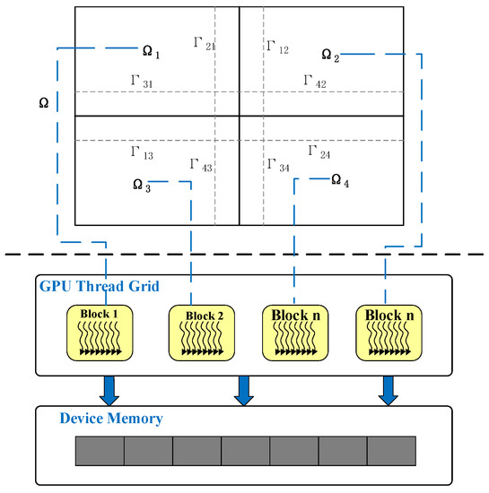 In this paper, domain decomposition method (DDM) is used as the method of parallel nonlinear equation Newton iteration which is frequently-used and effective in the serial software parallelization field. The basic point of DDM is that it divides the reservoir simulation domain into many small subdomains, each subdomain is assigned to a process to deal with. After calculation, processes communicate and update boundary data. Then we apply DDM on the GPU, and implement GPU-aided domain decomposition (GDDM). In Figure 3, GDDM divides reservoir domain into subdomain , , , , the same number CPU threads are launched, based on the GPU HypeQ feature, each CPU thread launches a group of GPU thread blocks to calculate the corresponding subdomain. The iteration repeats continuously until the global solution converges, i.e., , where is the linear model of F about x, is the relative error tolerance and means the absolute error tolerance.