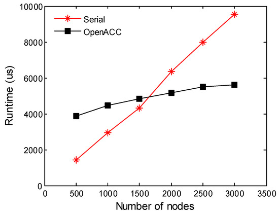 In the second experiment, we further compared the runtime of linear equation solvers from two methods. We also set the node number in the range from 500, 1000, 1500, 2000, 2500 to 3000, and other variables were set as default. As depicted in Figure 5, we observed that the timeline trend was similar to Figure 4, at the begining, the early vision serial code was faster. But while the node number increased, the proposed parallel started to outperform the other one. When the node number was set to 3000, the parallel was 2.1 times faster than the serial method. We thought the linear equation solver involved a large number of computation operation, so the GPU helped us to get better acceleration effect than the Jacobian matrix assembly.