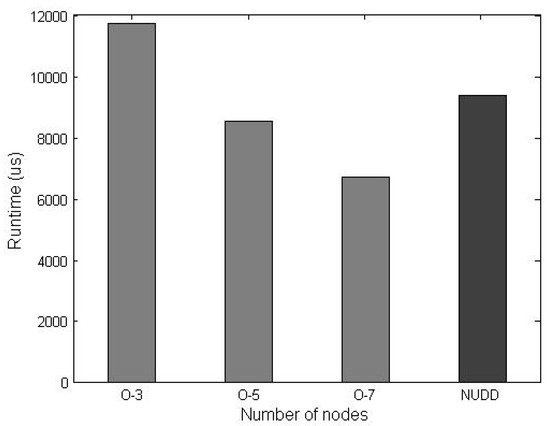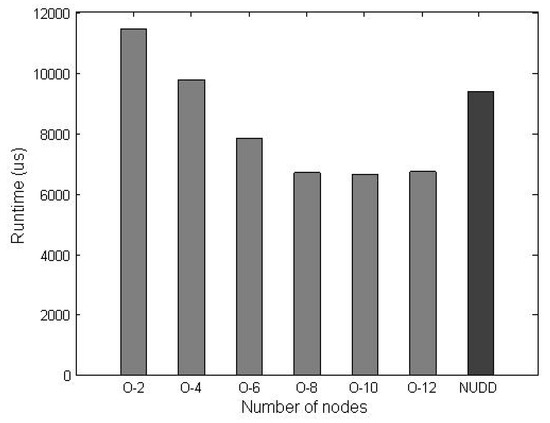 In this section, we evaluated the acceleration effect about the proposed above GPU-aided domain decomposition method. Here the variables were the number of subdomains and the number of overlapping layers from ASM. The total number of node was set to 3000, the sum time of the Jacobian matrix assembly and the linear solver was as the experimental result. In addition the method which only adopted OpenACC but not DDM was set as the baseline. Due to the limitation of the node number, the number of the subdomains was set to 9 and 25, the corresponding results were shown in Figure 6 and Figure 7 respectively. As a consequence, the other variable was set to related values, specifically, the number of overlapping layers was set ranging from 3, 5 to 7 in Figure 6 and from 2, 4, 6, 8, 10 to 12 in Figure 7. In these pictures, “O-number” was the number of overlapping layer where “O” representd the overlapping layer and “number” was the value, “NUDD” means that the GDDM was not used.