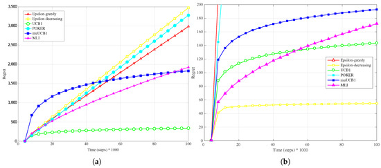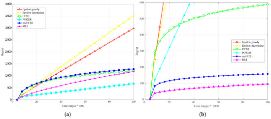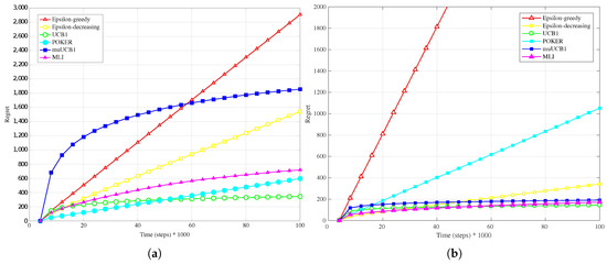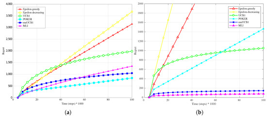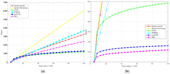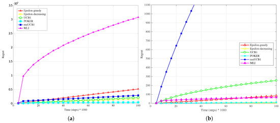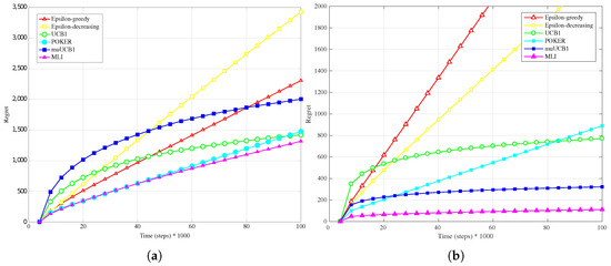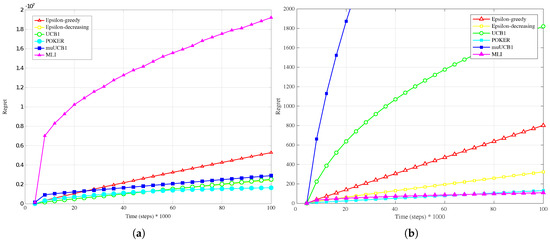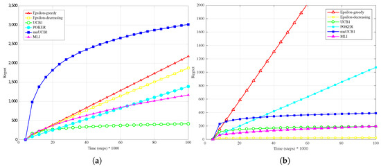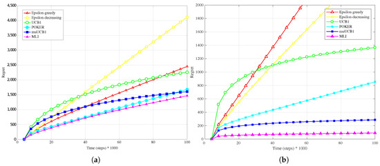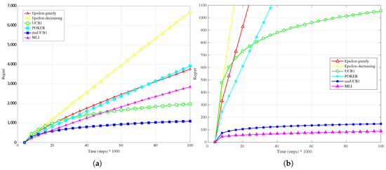 Finally, results for the exponential distribution, presented in Figure 7b, Figure 8b and Figure 9b, also confirm the behavior observed for the other distributions: MLI and muUCB1 algorithms lead to the best performance, and UCB1 is the only traditional algorithm leading to a logarithmic regret when , while -greedy, -decreasing and POKER algorithms show a steep linear regret over time.