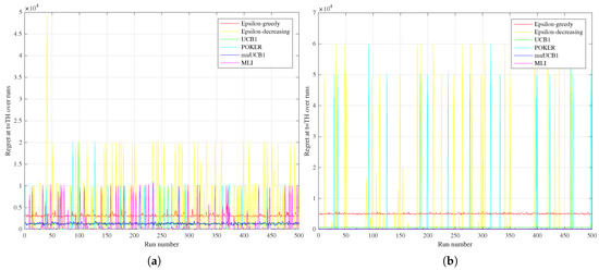 Regret achieved by the six considered algorithms at the time horizon as a function of the run, with a Bernoulli distribution for the reward PDF and . (a) Hard configuration; (b) Easy configuration.