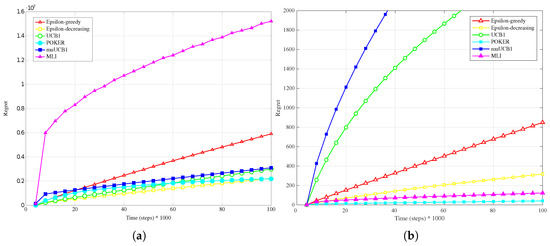Performance in terms of regret of the six considered algorithms, with real captured data used as reward and . (a) linear conversion; (b) logarithmic conversion.