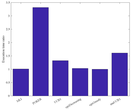 One last aspect worth mentioning regards computational complexity. Although a complete complexity analysis is not carried out in this work, the proposed algorithms were compared with existing ones by measuring the execution time assuming a ratio . Results are presented in Figure 14, showing the ratio between the execution time of each algorithm and the execution time of the -greedy algorithm, which proved to be the fastest one. Results show that -greedy, -decreasing and MLI algorithms require similar execution times. The UCB1 and muUCB1 are characterized by a slightly longer execution time, due to added complexity related to the calculation of indexes, while the POKER algorithm is significantly slower, reflecting the higher complexity in the evaluation of the arm to select, as discussed in [17]. A thorough analysis of complexity is planned in a future extension of this work.