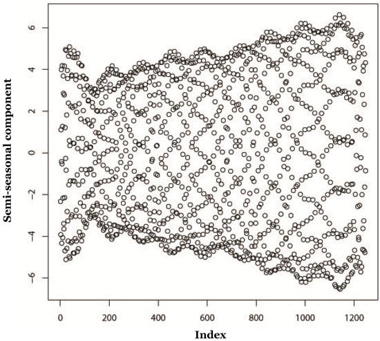 In our case, the problem of finding a reconstructed structure of the original series by SSA is the same as the identification of the eigentriples of the SVD from the trajectory matrix of this series, which correspond to the trend, the seasonal component, the semi-seasonal component, and noise. In practice, the means we used for noise extraction was the grouping of the eigentriples, which excludes the elements of trend, seasonal component, and semi-seasonal component.