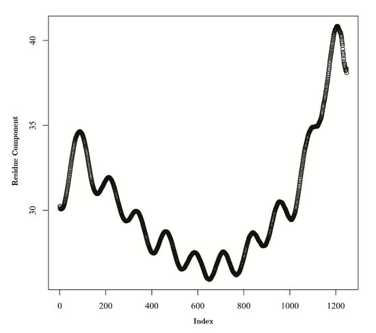 Singular Spectrum Analysis was put forward by Broomhead and King [8,9]. At first, it was widely used because of its effectiveness in reducing residuals. Later, Vautard et al. [10,11] applied this new SSA method in dealing with time series data and showed good results, especially for short, noisy, chaotic signals. At the same time, Ghil and Vautard [12] used SSA to analyze the time series of global surface air temperatures for the past 135 years. They found out that SSA can generate a secular warming trend and a small number of oscillatory modes; after the residual is separated, the original pattern of the series can be better explained. In 2002, Ghil et al. [13] reviewed different SSA methods used in the area of climate variables prediction. The various steps, advantages, and disadvantages were all discussed. In 2007, Golyandina and Osipov [14] analyzed the problem of applying SSA to time series with missing data. Their proposed algorithms result in the extraction of additive components of time series with simultaneous filling in of the missing data. SSA has also been applied to the area of finance and economics. Hassani and Thomakos [15] reviewed recent developments in the theoretical and methodological aspects of SSA in the area of economic and financial time series, and also present some new results. Again, Hassani et al. [16] applied univariate and multivariate singular spectrum analysis for predicting the value of changes in the daily pound/dollar exchange rate. A comparison to other models was presented, and the results showed that SSA is superior to other benchmarking models. Also, Hassani et al. [17] developed the multivariate SSA (MSSA) technique and demonstrated that MSSA can be a powerful method for time series analysis and forecasting. UK Industrial Production series were used to illustrate the main findings, and the result showed better accuracy compared with the autoregressive integrated moving average (ARIMA) and vector autoregressive (VAR) models. During recent years, the SSA algorithm has been widely used in various industries, and Safari et al. [18] even upgraded it as multi-scaled SSA (MSSSA) in making short-term forecasts for certain objects, such as wind power, which may have many chaotic components.