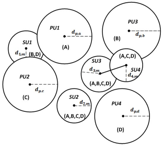 - Available matrix L. The matrix represents the availability of licensed bands for cognitive users. If , user n can access spectrum m without interference to primary users, otherwise . As shown in Figure 1, spectrum channel B is available for , then .