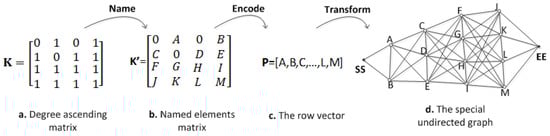 The transform process takes three steps: first, given the high computational complexity of resources allocation, IACO names only the non-zero elements in matrix K into binary sequences (the process of a to b in Figure 2); second, according to the row-major principle, we encode all letters into a row vector with the length of l that is the non-zero elements in K or (the process of b to c in Figure 2); third, based on the row vector P, we transform the letters into vertices of a special undirected graph except for the starting point and the ending point (the process of c to d in Figure 2). The ants move back and forth between to in the special graph to obtain the shortest paths (the optimal assignment scheme).