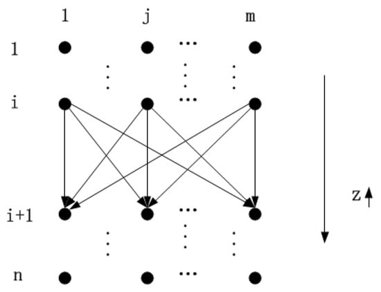 Step 5: Ants traversal. All ants move back and forth between the starting point and the ending point. As described below in Figure 3, spectrum allocation can be seen as row traversal, where row and column represent cognitive users and bands, respectively. In this row traversal, if the available channel number and , then band j is available for user i, that is to say node i in column j is visitable for ants, otherwise the ants skip the node. Then the evolution time .