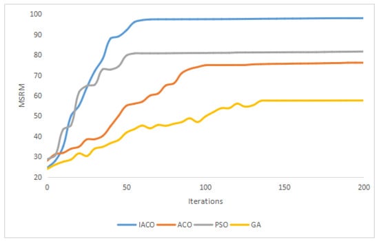 Figure 4 shows the MSRM trend with the increasing times of iteration under for different algorithms. In the first 50 iterations, GA is the slowest, ACO speeds up all the time but still inferior to PSO, and IACO is the best due to DE accelerating its convergence speed. At the later iteration, although PSO reaches the optimum firstly, its MSRM is lower than IACO; IACO has the highest MSRM in the end, because it adopts the VNS process to jump out of the local optimum.