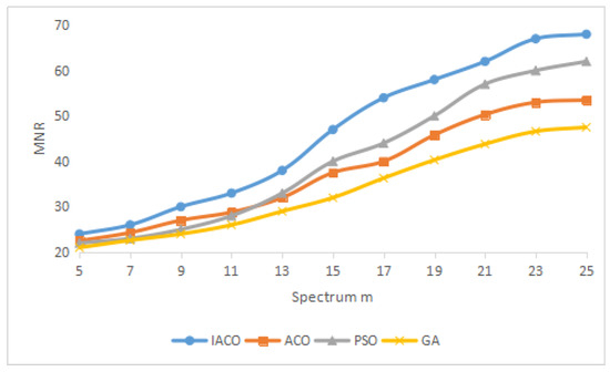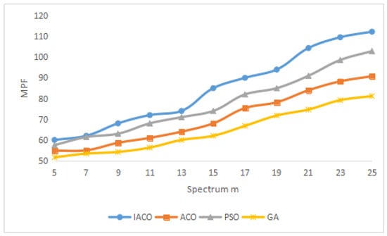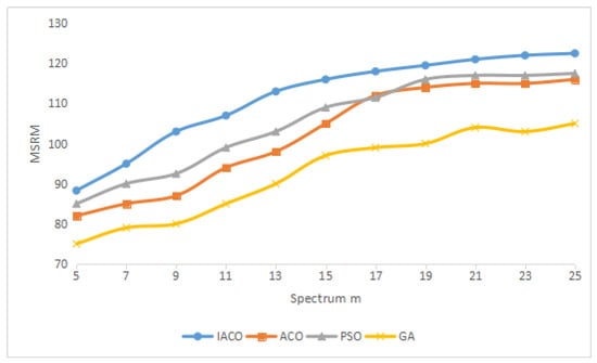 In this experiment, we show the MSRM, MPF and MMR trends with the increasing number of available licensed spectrum for different algorithms in Figure 5, Figure 6 and Figure 7, where the number of cognitive users is fixed on . In Figure 5, Figure 6 and Figure 7, all curves increase all the time. It can be seen that, if , MSRM grows quickly whereas MPF and MMR increase slowly because of the competition for access to spectrum in cognitive users. If , with the increasing of licensed spectrum number, MPF and MMR grow rapidly. Also, IACO is the best all the time.