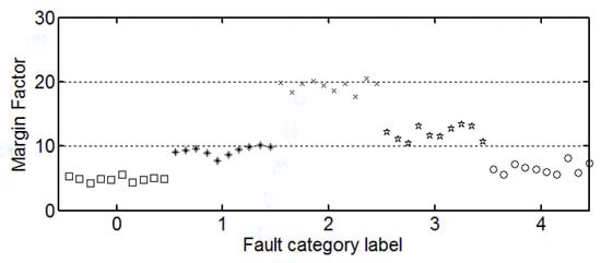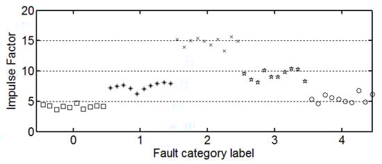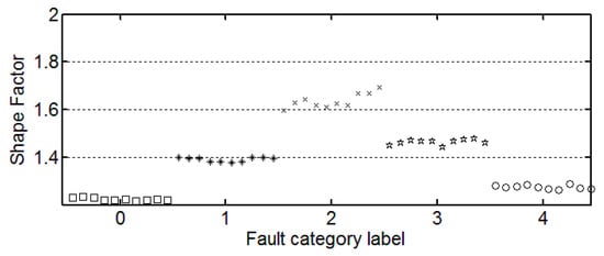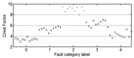It can be seen from these figures that except for the sample labeled 2 (bearings with 0.014 inch fault), a single index cannot distinguish the bearing samples with different fault degrees well. The samples with different labels have a confusion in the value of feature and do not have a good distinction. Taking the trend of the kurtosis factor (Figure 7) as an example, the kurtosis factor of a normal bearing (label 0) and the kurtosis factor of a bearing with 0.028 inch fault (label 4) are basically in the same range. It is difficult to distinguish between the two categories by this feature. Therefore, the neural network degradation model is proposed based on multiple features of samples to identify and classify faults.