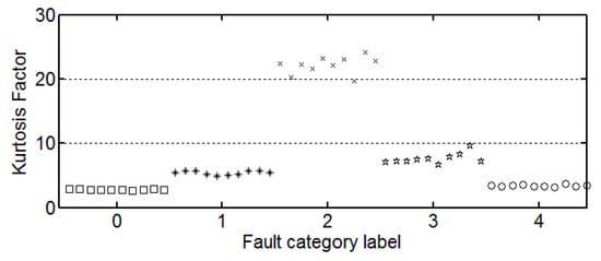 The kurtosis is mainly effective in analyzing whether the signal contains a pulse fault. The expression is as shown in Equation (5):