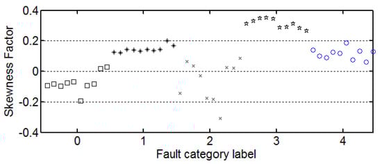 The skewness reflects the asymmetry of the probability density function of the signal distribution with respect to the ordinate, and the larger the skewness value is, the more serious the asymmetry is. This feature calculates the third-order central moment of the sample space, as shown in Equation (4):