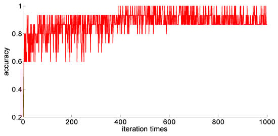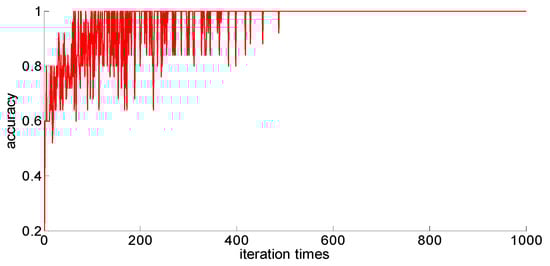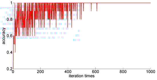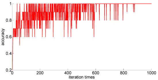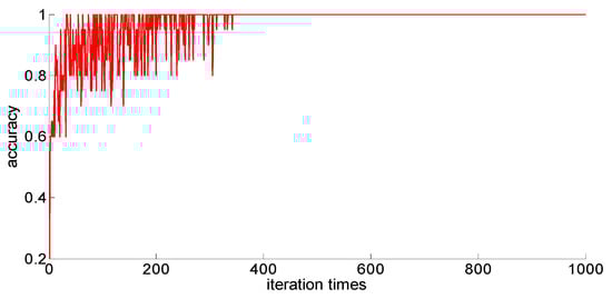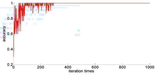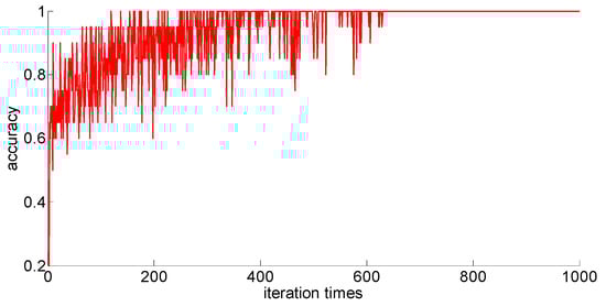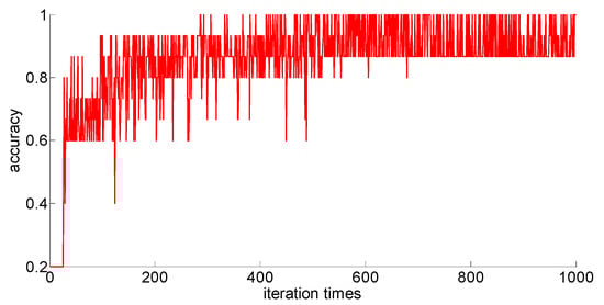 For the size of the neural network, it is known that there are seven neurons (seven features) in the input layer, five neurons in the output layer (five bearings with different degrees of failure). As the number of hidden neurons in a neural network increases, the learning performance of a neural network is better, but the computation speed of the neural network is slower. In this paper, a benchmark is given when all the verification sample samples can be correctly classified after 1000 iterations. There are 50 training samples to test the minimum number of neurons needed for the hidden layer of the neural network. At the time of testing, the undetermined initial learning rate was set to 1. Hidden layer neuron number adjustment process is shown in Table 5. Here the accuracy of classification achieves 100% for 30 or 40 number of neurons. As the accuracy of classification is only the basic feature, we can make future analysis in the following sections. If we cannot get enough sampling data on faulty and healthy systems as in this experiment, indicators such as sensitivity, specificity and ROC (receiver operating characteristic) curve may be selected for the actual data.