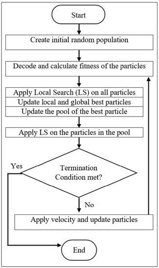 We represent a particle in PSO in an encoded vector form to apply PSO operations easily on them. Hence, we also propose a decoding method to build a real comprehensive solution out of a particle. The overall workflow of proposed bilayer local search-enhanced particle swarm optimization (BLS-PSO) is sketched in Figure 2.