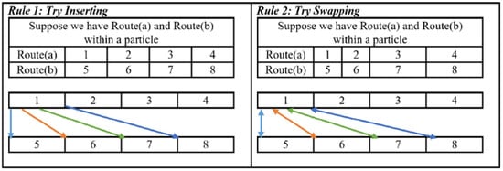 PSO was first proposed for continuous problem domains where can be considered as vector addition and as vector subtraction. However, CVRP is defined in discrete domain. Hence, to apply PSO in discrete domain, we adopt the swap sequence-based PSO [54]. We need to map the meaning of Equations (10) and (11) so that PSO can deal a discrete type problem. In this purpose [54], authors proposed a new definition to the characteristics of two symbols, and . X SS means applying a sequence of swap sequence on the elements of X to reach Y, a new position in the solution space, while X W gives a basic swap sequence BSS, the applying of which W can be converted to X. A detailed description is presented here to understand the mechanism of the operators.