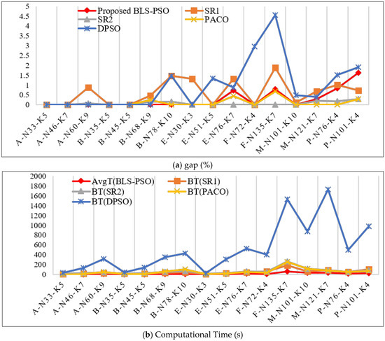The overall results are also graphically represented in Figure 7 to show the comparative performances more comprehensively. The negative gap in Figure 7a corresponds to the problem instance, for which the BLS-PSO has obtained a new optimal result. Figure 7b demonstrates that time consumed by BLS-PSO is significantly less than the other approaches, where the plot is almost touching the horizontal axis for all the instances.
