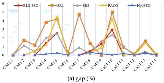 Figure 8 shows clearer comparative graphical representations of the performances of the PSO-based algorithms dealing instances in Set CMT. Here, BLS-PSO has obtained results equal to the best known results with an average gap of 0.64% whereas SR1, SR2, PACO and HybPSO have gap of 1.788%, 0.874%, 0.913% and 0.084% respectively. However, the average of the reported CPU times required by BLS-PSO is only 13.33 s to solve the instances in Set CMT whereas the average of the best times required by SR1, SR2, PACO and HybPSO are 84.1 s, 163.1 s, 302.58 s and 48.13 s, respectively. Hence, although the gap values obtained by the proposed algorithm are higher than the other methods for some instances, BLS-PSO is found to reach to the best known results for most of the cases in significantly lower computational times as compared to the other algorithms. This advocates for its efficiency.
