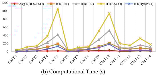 To portray the comparison of the performance of our proposed algorithm with other PSO-based algorithms in the literature, we have taken the same instances used by other researchers [41,44,47,52]. Table 11 contains the results for 16 instances from the Sets A, B, E, F, M and P, and Table 12 lists results for all the 14 instances of Set CMT. Here, PSO-based algorithms DPSO [41], SR1, SR2 [44,46] and PSCO [52] are compared with proposed BLS-PSO. Here, Cost is the result obtained by respective algorithms and a value is in boldface font when it is equal to the best-known result reported in the literature. The superscript “a” indicates that the cost is inferior to what is achieved by the proposed BLS-PSO. BT refers to the computational time in seconds to reach the corresponding result. For the proposed algorithm, we have reported the AvgT as mentioned earlier. As mentioned above there are no convergence of solution for specific k2 and k3 value, we have mentioned AvgCost as the average of all the solutions obtained by BLS-PSO for different k2 and k3. The deviation of the AvgCost with the best-known solutions is mentioned as SD in Table 11. It is evident that even the average time taken by the proposed method is far better, let alone the shortest time, than the shortest time of other approaches for each of the problem instances under consideration.