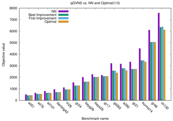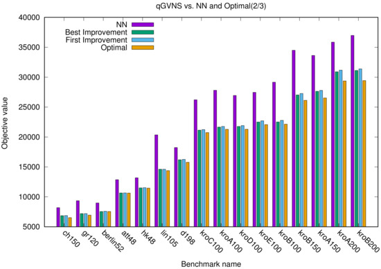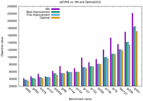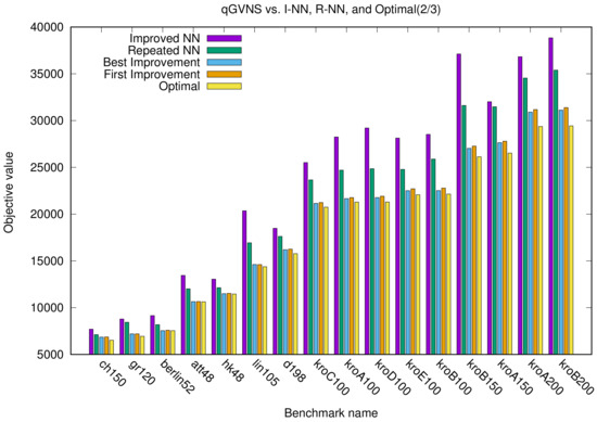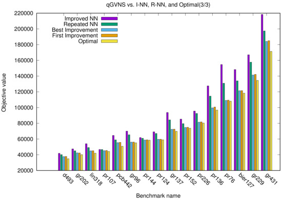 Figure 6 demonstrates once again the superiority of GVNS. Let us consider benchmark pr76, where GVNS touches the optimal point, while both the repeated and improved NN have a much lower performance. In addition, in Figure 4, Figure 5 and Figure 6, we can see for a different set of benchmarks that again GVNS outperforms the NN variants, significantly closer to the optimal value in each case.