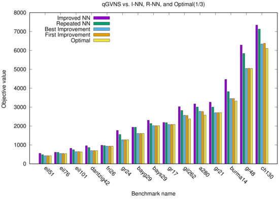 In the next set of figures (i.e., Figure 4, Figure 5 and Figure 6), each benchmark is represented with five different bars; one for the improved NN algorithm, one for the repeated NN algorithm, one for the optimal value, and another two for our implementation (best and first improvement). A close examination reveals that GVNS is once again very close to optimal values, whereas the improved and repeated NN algorithms fail to provide equally good solutions.