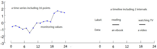 A timeline describes a series of interval event data, which is to be different from continuous quantitative time-series data [1], as shown in Figure 1. The time series data are often sensor-making, for example, some monitoring values. There are a lot of excellent researches that are focused on indexing massive time series or data series [2,3,4,5]. Most of them are based on the Symbolic Aggregate approXimation (SAX) strategy of iSAX [2]. However, a timeline is often a set of interval objects with labels and data. It is often not continuous, but rather discrete and hard to be organized as SAX words.