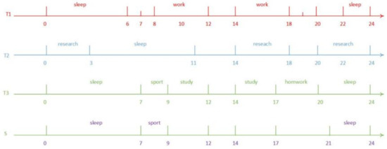 In addition, the data volume of the timelines mainly concentrates on their labels and attachment data. The labels indicate the type of intervals that are contained by the timeline. The data is an attachment of the labeled interval. The data may be text, image, or some other row binary data. As demonstrated in Figure 2, China, Japan, and Korea are long period historical timelines. Timelines can also be short. As shown in Figure 3, T1, T2, and T3 are daily timelines for worker, researcher, and pupil, respectively. A timeline often indicates the types of events being represented, the number of events, the chronological time when they occurred in, the order in which they occurred, how long they lasted, and whether any of them met or overlapped. For instance, suppose that the timeline S in Figure 3 represents a standard healthy daily timeline. We want to know which timeline in the tree timelines of T1, T2, and T3 is the most like S. Perhaps we can tell the result is T3 at a glance, because there are more overlaps with same labels between S and T3. However, such manual comparison will be hard to accomplish while the dataset is large. Hence, we defined a timeline similarity function that is shown in next section to evaluate it. Not only the storage of big timeline dataset but also the similarity query of timelines requires effective and efficient access methods. However, none of the existing special index structures have dealt with such methods yet.