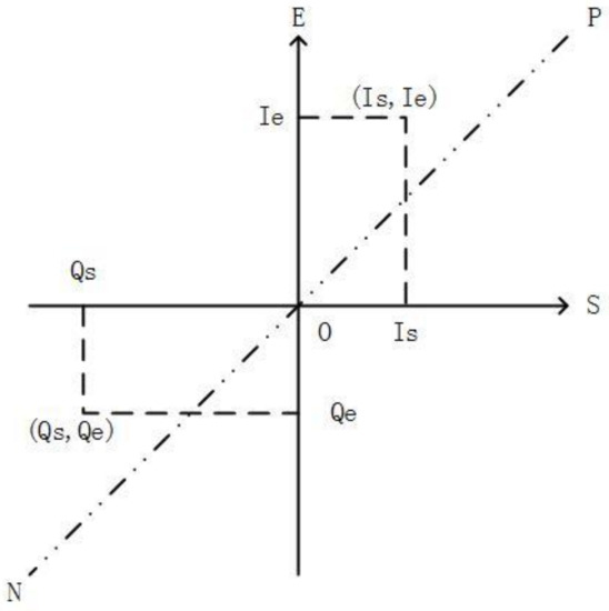 If an interval represents a two-dimensional (2D) point value, its type must be IT_CLOSED, and Is = Ie. An interval can be described as a point in a 2D plane, as shown in Figure 4 [9]. The axis S is the starting value of the interval, and axis E is the ending value of the interval. Because Ie is always larger than or equal to Is, the region below the line NP is always empty in the two-dimensional space. This offers the possibility for reducing the query computation by skipping the empty region. Our previous work [9] described 15 distinct algebra relationships between two intervals. Each of the 15 interval algebra relationships can be represented as a point, line, and region in the 2D space. If the universal interval is [Is, Ie], and the input interval of a query is [Qs, Qe], we can represent the relationships of two interval objects in two-dimensional space, as defined in Table 2.