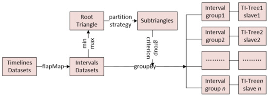 According to Equation (4), a DTI-Tree has a global index, T-Tree, in the master node, and a series of TI-Trees in n slave nodes. Assume that TD is a timeline data set, the total number of timeline objects is TN, Tt is a timeline in TD and t [0, TN − 1]. The first step of the data partition is to load the timeline data set from HDFS and to call the function flapMap in Table 3 to execute a mapping from timeline data set to interval data set IDS. Then, we get the minimum and maximum values of the interval data set IDS from the interval Spark Resilient Distributed Datasets (RDD) by calling the functions max and min in Table 3. A root triangle of the T-Tree will be set up on the base of the minimum value and maximum value by the algorithm that is presented in [9]. The root triangle will be partitioned into n sub triangles by the partition strategy that is mentioned in Section 3.1. Each sub triangle is related to a slave node. The last step is to call the function groupBy listed in Table 3 to form n groups according to the interval point location in a certain sub triangle. The main construction process is shown in Figure 10. The second phase is the construction of T-Tree according to the sub triangles. Its construction is simple because the T-Tree is an absolute binary search tree. The last phase is the constructions of TI-Trees. The TI-Tree is an extension of the TD-Tree’s [8]. They share almost all the algorithms except the construction methods. The Algorithm 2 shows the process for constructing TI-Trees.