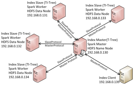 As mentioned in the previous sections, the timeline data are stored in HDFS. We use Spark (version 2.2.1) RDD to load the dataset from HDFS (version 2.7.3). Without special instructions, all of the experimental results were computed on a cluster, including five computers, as shown in Figure 12. The HDFS name node, Spark master and index master are on the same node which is a workstation computer with the configuration of two 2.80 GHZ Intel(R) Xeon(R) CPUs, and 32 GB RAM. Each slave node is a computer which has 16 GB RAM, a 64-bit dual core i5 processor, and a 7200 rpm 1TB disk. It plays roles of the HDFS data node, Spark worker, and index slave. The client is a computer that has an Intel® Core™ i7 processor and 8 GB RAM. The communications among the master node, the slave node, and the client are implemented by the Hadoop Remote Procedure Call (RPC) (https://wiki.apache.org/hadoop/HadoopRpc). We design two protocol interfaces, called MasterProtocol and SlaveProtocol, to support the communications. The operation systems of the cluster are all Ubuntu 16.04. All the algorithms are implemented by java (JDK 1.8.0_144) using IntelliJ IDEA 2017 (community edition).