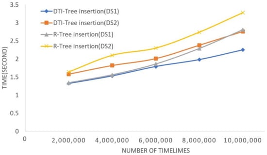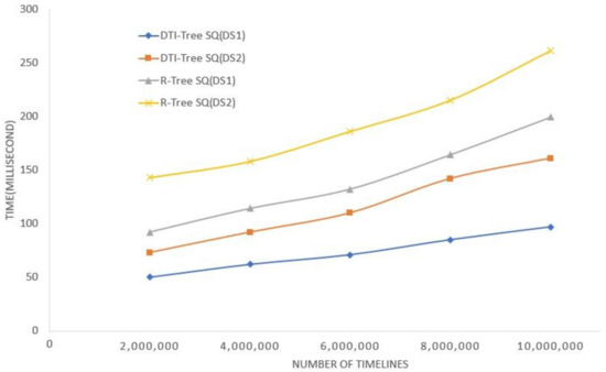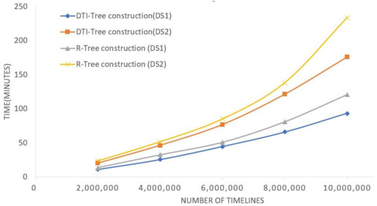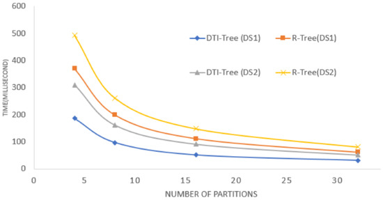 The experimental results of index construction performance test are shown in Figure 13. The X axis is the number of timeline objects involved in the experiment. The Y axis is the time cost. The DTI-Tree and R-Tree were constructed with the number of timeline objects varying from 1,000,000 to 10,000,000. There are eight fixed partitions for running this test. The result shows that the DTI-Tree has higher construction performance than the R-Tree. The result also shows that the DTI-Tree has lower performance when it handles the long timeline dataset DS2. The reason is that the longer the average length of the intervals, the bigger the dataset, and the computation takes a longer time to construct the DTI-Tree. Therefore, it is better to implement the DTI-Tree construction by bulk loading of the dataset to reduce the Spark RDD construction time cost.